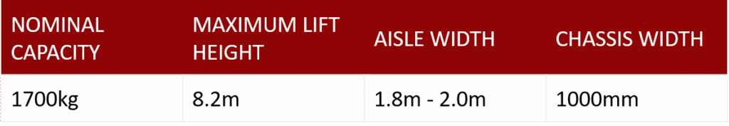 هيكل بعرض 1.2 متر / 48 بوصة بدقة نصف قطر حقيقي، مع ميزة الدوران الأصلي 220°، ما يسمح بالدوران الآمن وسرعة تخزين المنصات في أرفف الممرات الضيقة جدًا.