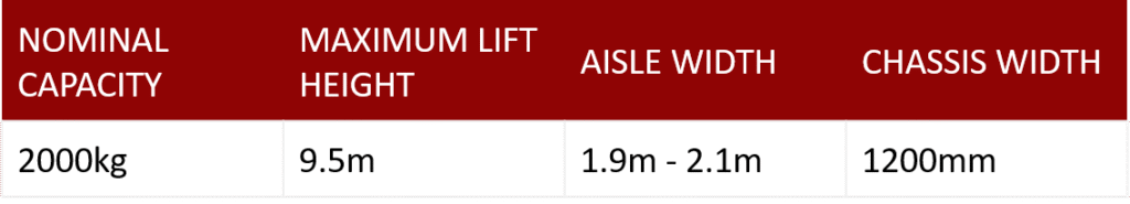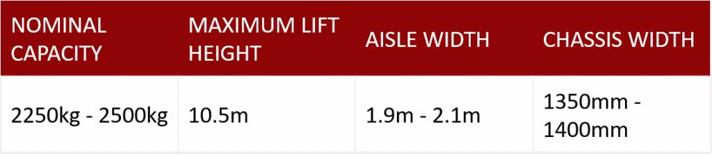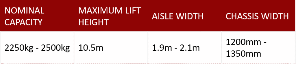 يقدم هيكل بسعة 2.5 طن / 5000 رطل مع إطارات خلفية مطاطية مرنة قدرة تحميل واستقرار ممتازين حتى ارتفاع 13.0 متر / 512 بوصة على أي أرضية مستودع، دون الحاجة إلى نظام توجيه.