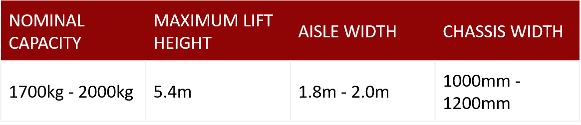 تعمل Flexi 20S في ممرات بعرض 2.0 متر / 79 بوصة (EURO) أو 1.8 متر / 71 بوصة فقط.