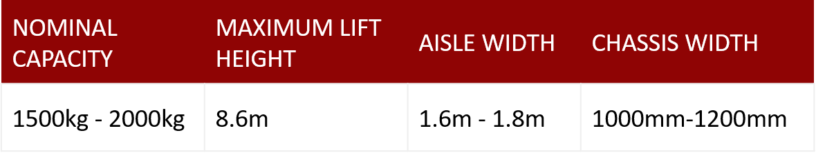 تعمل رافعة Flexi 15VN جنبًا إلى جنب مع شاحنات المستودعات VNA (الممرات الضيقة جدًا) الموجهة بأسلاك تحريضية أو قضبان فولاذية.